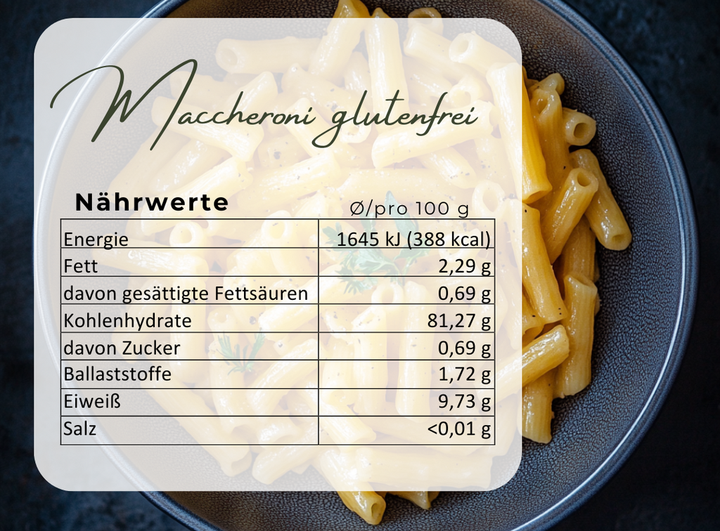 Unsere glutenfreien Maccheroni sind die perfekte Wahl für alle, die eine italienische Pasta genießen möchten, ohne sich um Gluten sorgen zu müssen. Mit der klassischen Form der Maccheroni ist dieses Produkt ein Muss für jeden Pasta-Liebhaber.