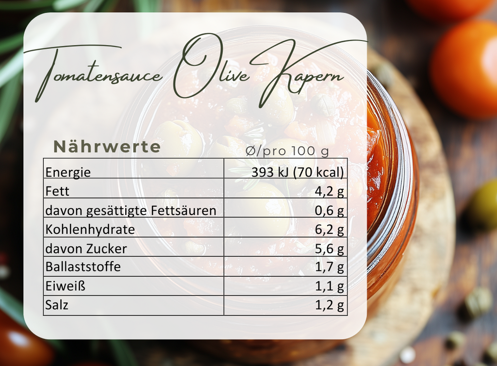 Im Mittelpunkt stehen vollreife, sonnengereifte Tomaten, die die Basis der Sauce bilden und ihr eine natürliche Süße sowie eine angenehme Säure verleihen. Hinzu kommen saftige grüne und schwarze Oliven, die mit ihrem leicht salzigen, fruchtigen Charakter die Sauce abrunden. Kapern sorgen für eine kräftige, würzige Note, die den mediterranen Charakter der Sauce hervorhebt.