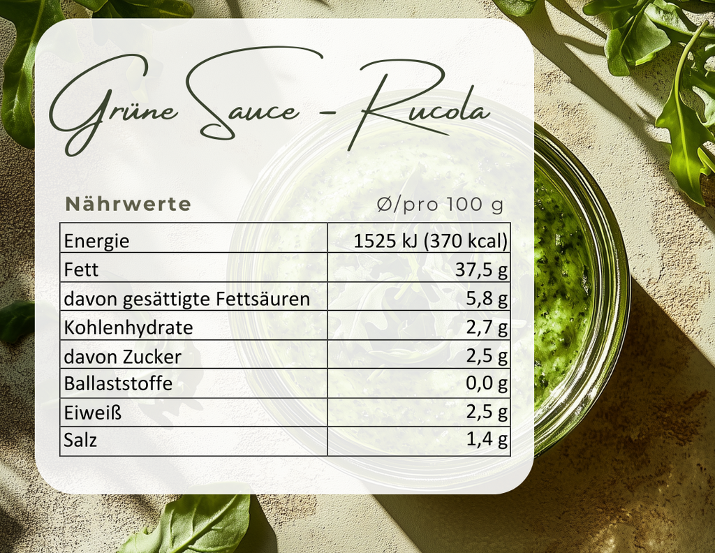 Im Mittelpunkt steht der feine, aromatische Rucola, dessen leicht würziges, nussiges Aroma der Soße ihre unverkennbare Note verleiht. Ergänzt wird er durch edle Mandeln, die mit ihrer zarten Süße und samtigen Textur eine perfekte Balance schaffen. Eine erlesene Mischung aus frischen mediterranen Zutaten wie extra nativem Olivenöl und einer Prise Knoblauch sorgt für ein harmonisches Zusammenspiel der Aromen, während ein Hauch von Zitrone der Sauce eine angenehm frische Nuance verleiht.